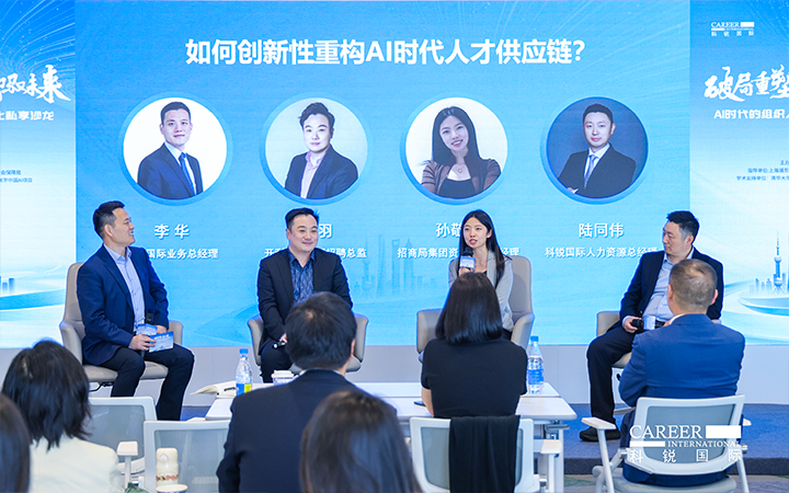 圆桌讨论环节,由918博天堂官网国际业务总经理李华主持,开利亚太总部招聘总监邹羽、招商局集团资深AI产品经理孙敬萍、918博天堂官网国际人力资源总经理陆同伟三位专家,分别从外资、央国企和民企视角,围绕AI时代人才供应链创新性重构话题展开深度对话。